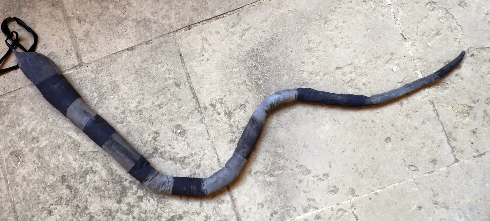 The tail was made by sewing lots of scraps together to make a big rectangle. The tail pattern is a long thin isosceles triangle, folded in half and stuffed. Stuffing the tail was difficult, because you can't really poke the stuffing to the end of the tail. I ended up hand-sewing the tail shut for 10cm, then adding stuffing, then sewing, then adding more stuffing, until the whole thing was stuffed. I didn't have Dacron or similar, so used scraps of satin and some wig fibres that I had (I massacred a blonde wig, and there were lumpy unusable wefts everywhere). Using watered down grey acrylic paint, I painted the tail light grey, then used a thicker paint mix to paint on the darker stripes. Lastly I added a ribbon to tie around my waist.
